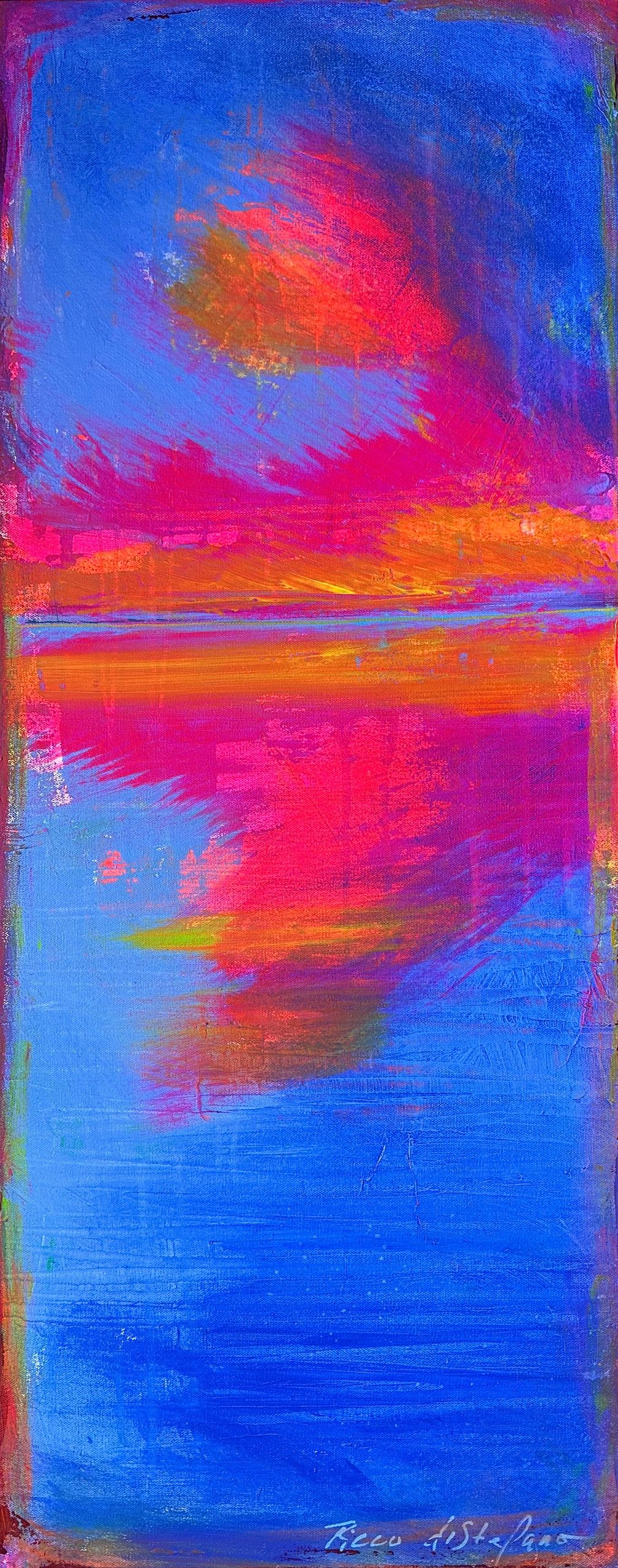 A beautiful painting can brighten any day. This powerful stormy sunset over water was painted live in front an audience at the MixItUp Home gallery in the summer of 2025. Please inquire directly through the link for purchase information